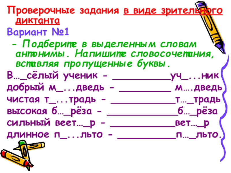 Слайд 14Проверочные задания в виде зрительного диктанта