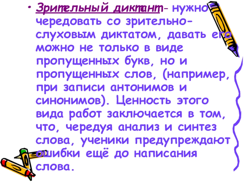 Слайд 13Зрительный диктант – нужно чередовать со зрительно-слуховым диктатом, давать его можно