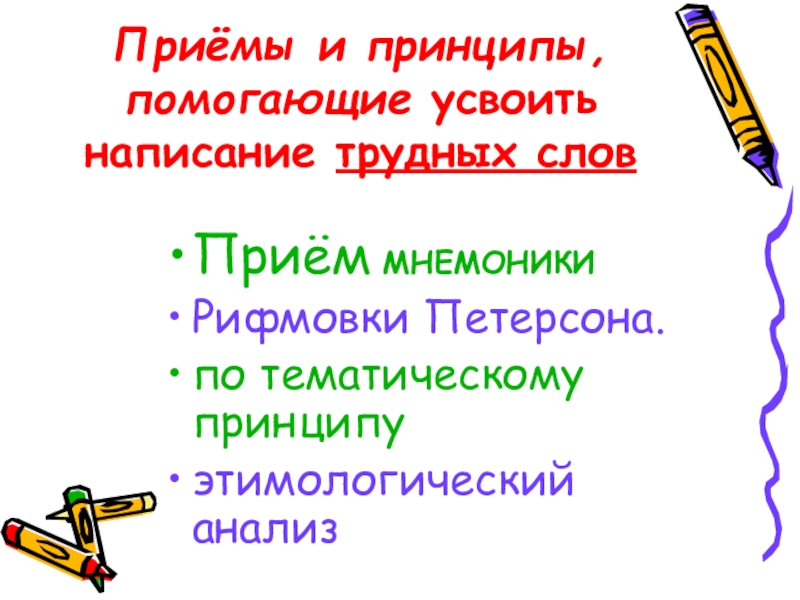 Слайд 5Приёмы и принципы, помогающие усвоить написание трудных слов