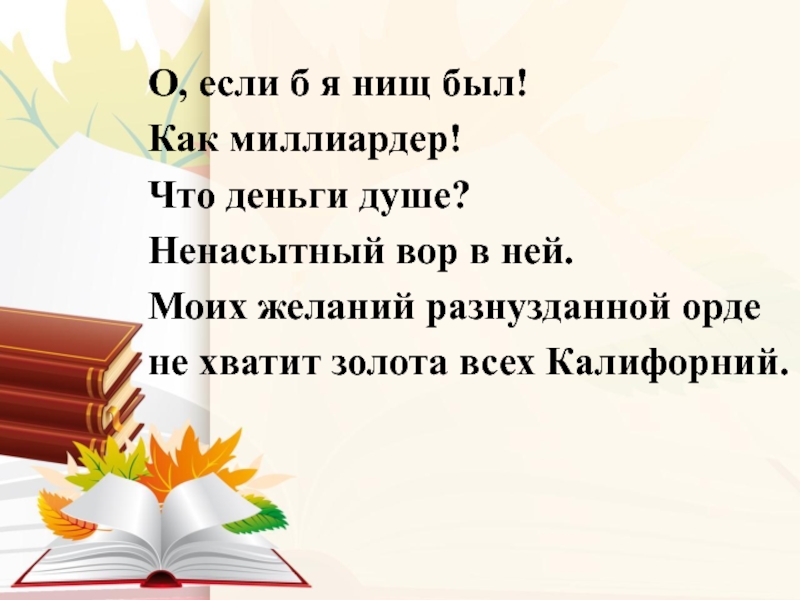 Слайд 82О, если б я нищ был!
