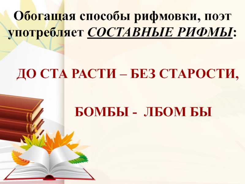Слайд 20Обогащая способы рифмовки, поэт употребляет СОСТАВНЫЕ РИФМЫ: