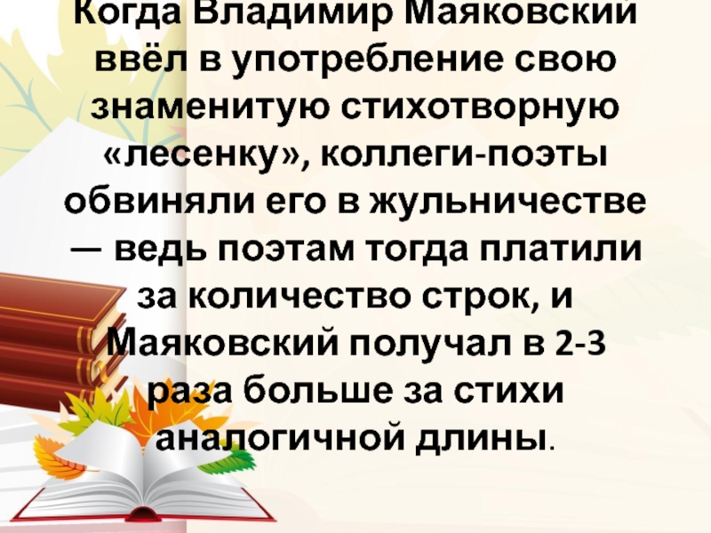 Слайд 6Когда Владимир Маяковский ввёл в употребление свою знаменитую стихотворную «лесенку», коллеги-поэты