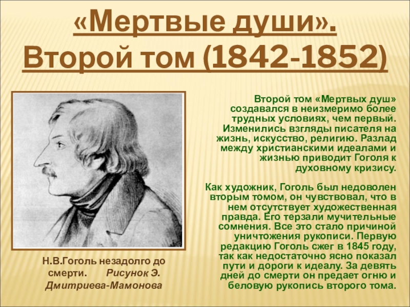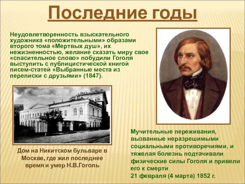 Мучительные переживания, вызванные неразрешимыми социальными противоречиями, и тяжелая болезнь подтачивали физические силы Гоголя и привели его к смерти