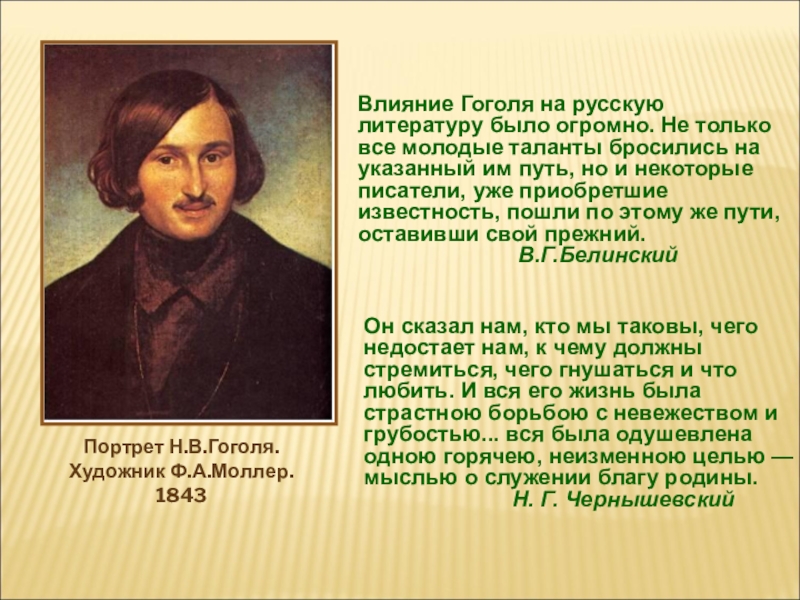 «Дорого русскому сердцу имя Гоголя, ...никто лучше его не понимал всех оттенков русской жизни и русского характера, никто так поразительно верно не изображал русского общества; лучшие и современные деятели нашей литературы могут быть названы последователями Гоголя; на всех их произведениях лежит печать его влияния, следы которого еще долго, вероятно, останутся в русской словесности». Д.И.Писарев