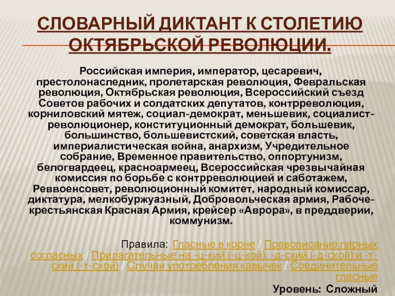 Слайд 10Словарный диктант к столетию Октябрьской революции.
