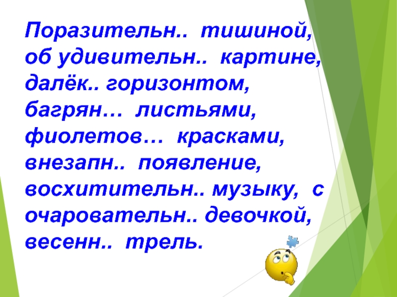 Слайд 4Поразительн.. тишиной, об удивительн.. картине, далёк.. горизонтом, багрян… листьями, фиолетов… красками,