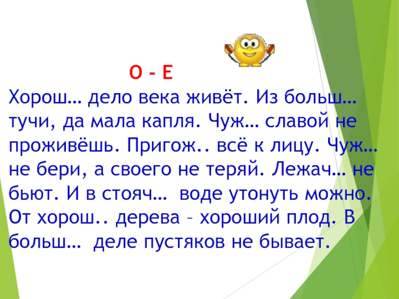 Хорош… дело века живёт. Из больш… тучи, да мала капля. Чуж… славой не проживёшь. Пригож.. всё к лицу. Чуж… не бери, а своего не теряй. Лежач… не бьют. И в стояч… воде утонуть можно. От хорош.. дерева – хороший плод. В больш… деле пустяков не бывает.