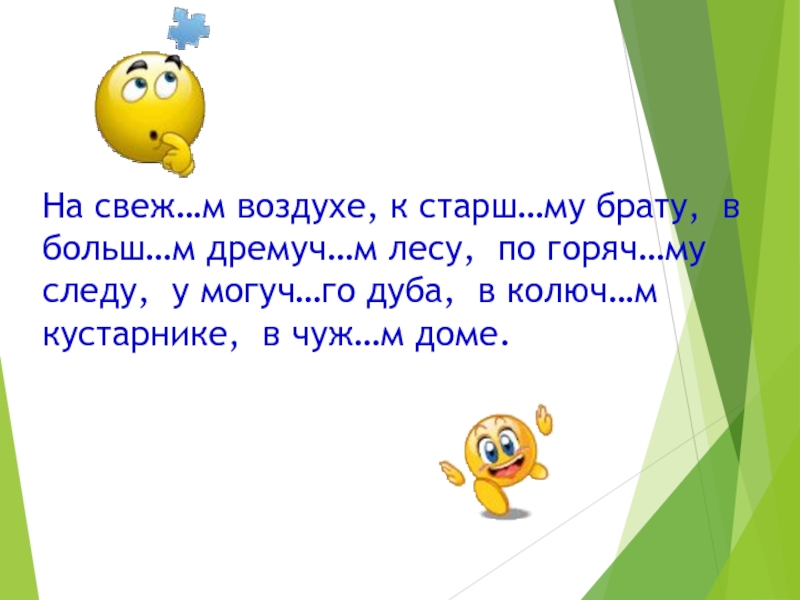 Слайд 12На свеж…м воздухе, к старш…му брату, в больш…м дремуч…м лесу, по