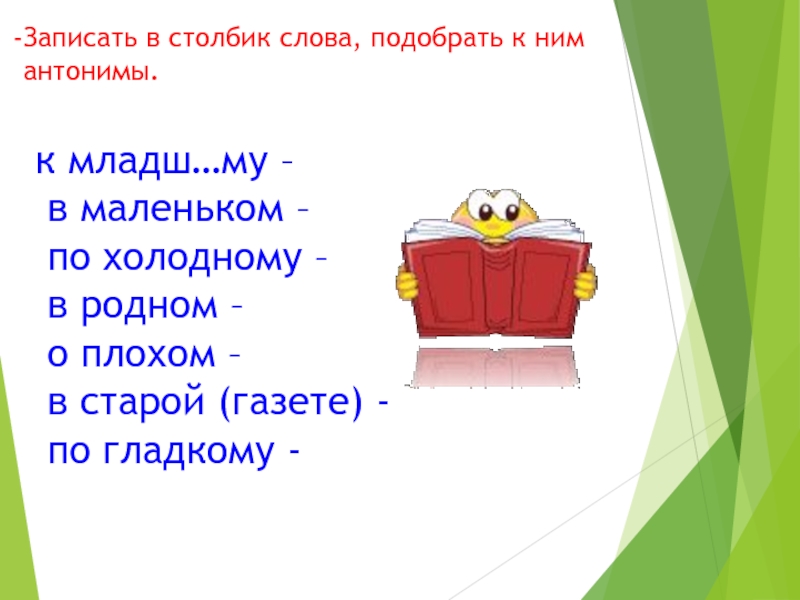 Слайд 14Записать в столбик слова, подобрать к ним антонимы.