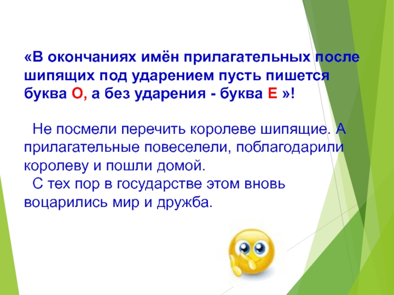Не посмели перечить королеве шипящие. А прилагательные повеселели, поблагодарили королеву и пошли домой.