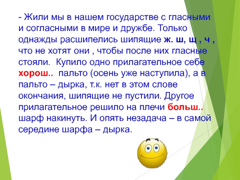мире и дружбе. Только однажды расшипелись шипящие ж. ш, щ , ч , что не хотят они , чтобы после них гласные стояли. Купило одно прилагательное себе хорош.. пальто (осень уже наступила), а в пальто – дырка, т.к. нет в этом слове окончания, шипящие не пустили. Другое прилагательное решило на плечи больш.. шарф накинуть. И опять незадача – в самой середине шарфа – дырка.