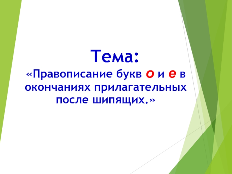 Слайд 1Правописание букв о и е в окончаниях прилагательных после шипящих
