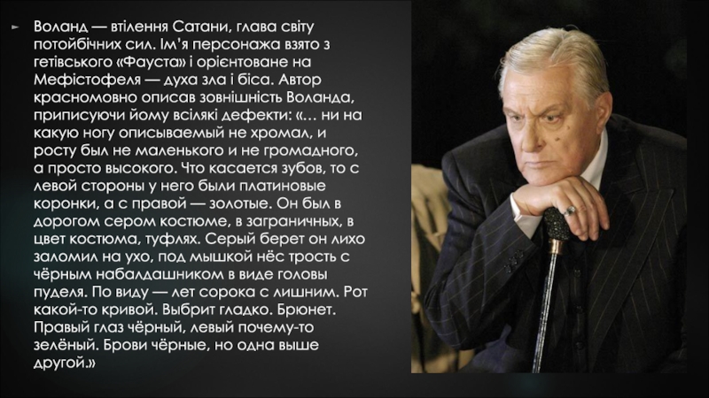 з гетівського «Фауста» і орієнтоване на Мефістофеля — духа зла і біса. Автор красномовно описав зовнішність Воланда, приписуючи йому всілякі дефекти: «… ни на какую ногу описываемый не хромал, и росту был не маленького и не громадного, а просто высокого. Что касается зубов, то с левой стороны у него были платиновые коронки, а с правой — золотые. Он был в дорогом сером костюме, в заграничных, в цвет костюма, туфлях. Серый берет он лихо заломил на ухо, под мышкой нёс трость с чёрным набалдашником в виде головы пуделя. По виду — лет сорока с лишним. Рот какой-то кривой. Выбрит гладко. Брюнет. Правый глаз чёрный, левый почему-то зелёный. Брови чёрные, но одна выше другой.»