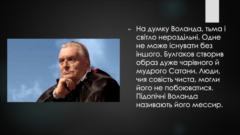 без іншого. Булгаков створив образ дуже чарівного й мудрого Сатани. Люди, чия совість чиста, могли його не побоюватися. Підопічні Воланда називають його мессир.