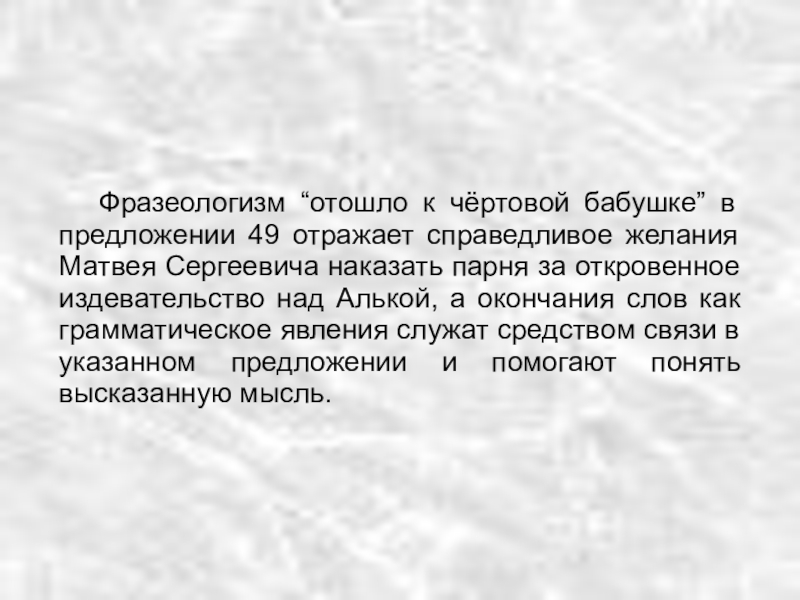 Слайд 12 Фразеологизм “отошло к чёртовой бабушке” в предложении 49 отражает
