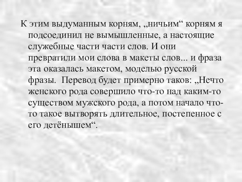 настоящие служебные части части слов. И они превратили мои слова в макеты слов... и фраза эта оказалась макетом, моделью русской фразы. Перевод будет примерно таков: „Нечто женского рода совершило что-то над каким-то существом мужского рода, а потом начало что-то такое вытворять длительное, постепенное с его детёнышем“.