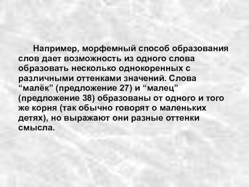 одного слова образовать несколько однокоренных с различными оттенками значений. Слова “малёк” (предложение 27) и “малец” (предложение 38) образованы от одного и того же корня (так обычно говорят о маленьких детях), но выражают они разные оттенки смысла.