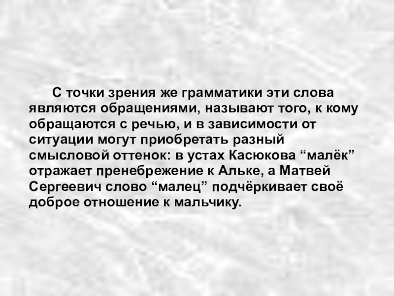 обращениями, называют того, к кому обращаются с речью, и в зависимости от ситуации могут приобретать разный смысловой оттенок: в устах Касюкова “малёк” отражает пренебрежение к Альке, а Матвей Сергеевич слово “малец” подчёркивает своё доброе отношение к мальчику.