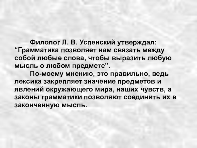 Слайд 18 Филолог Л. В. Успенский утверждал: “Грамматика позволяет