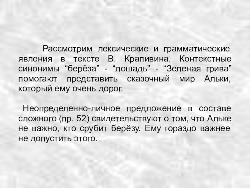 Крапивина. Контекстные синонимы “берёза” - “лошадь” - “Зеленая грива” помогают представить сказочный мир Альки, который ему очень дорог.