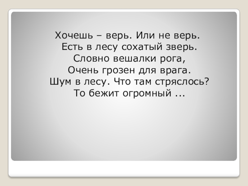 Хочешь – верь. Или не верь. Есть в лесу сохатый зверь. Словно вешалки рога, Очень грозен