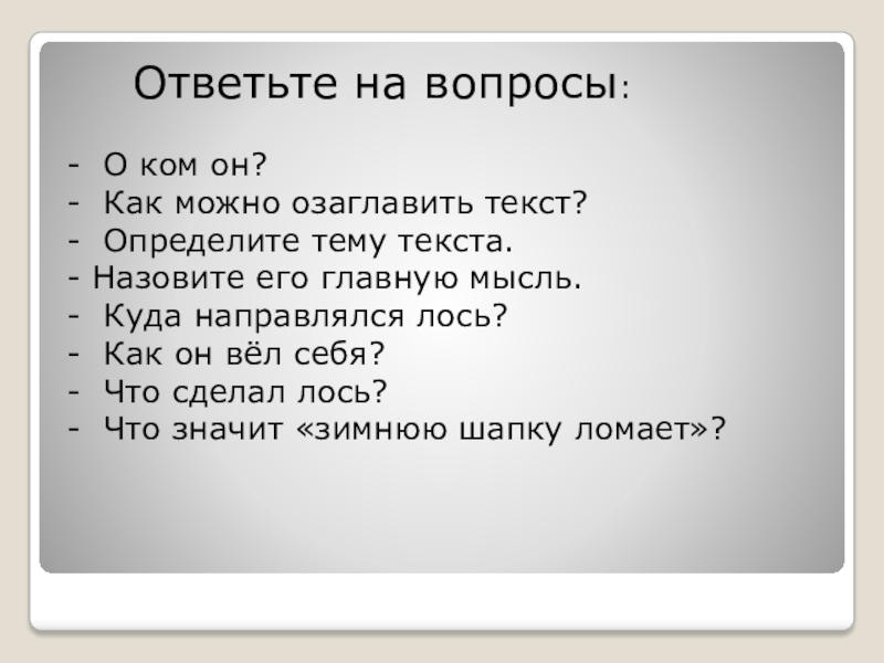 Ответьте на вопросы:- О ком он?-  Как можно озаглавить текст?-  Определите тему текста.- Назовите его