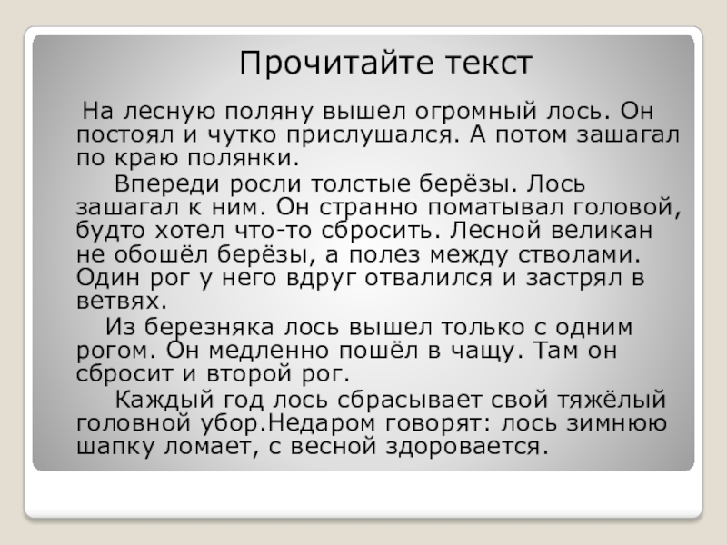 Прочитайте текст    На лесную поляну вышел огромный лось. Он постоял и чутко