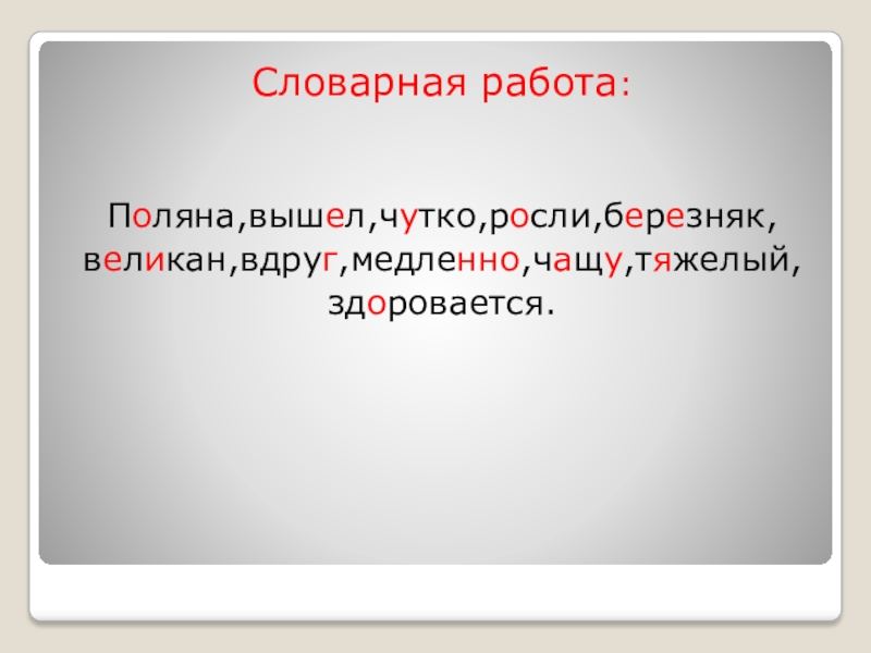 Словарная работа:Поляна,вышел,чутко,росли,березняк,великан,вдруг,медленно,чащу,тяжелый,здоровается.