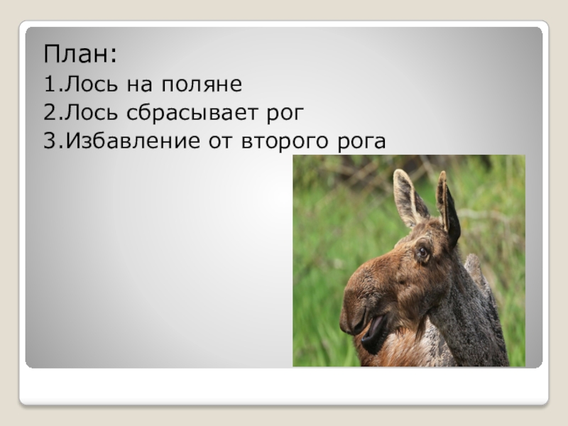 План:1.Лось на поляне2.Лось сбрасывает рог3.Избавление от второго рога