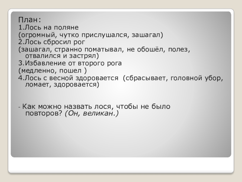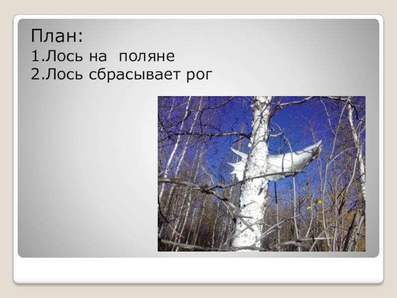 Слайд 8 План: 1.Лось на поляне 2.Лось сбрасывает рог