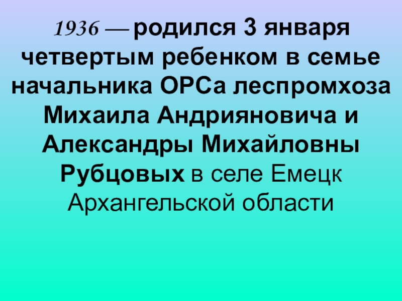 1936 — родился 3 января четвертым ребенком в семье начальника ОРСа леспромхоза Михаила Андрияновича и Александры Михайловны Рубцовых в селе Емецк Архангельской области