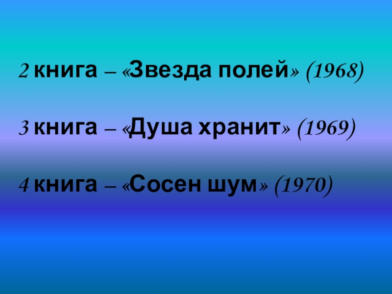 Слайд 122 книга – «Звезда полей» (1968) 3 книга – «Душа хранит» (1969) 4