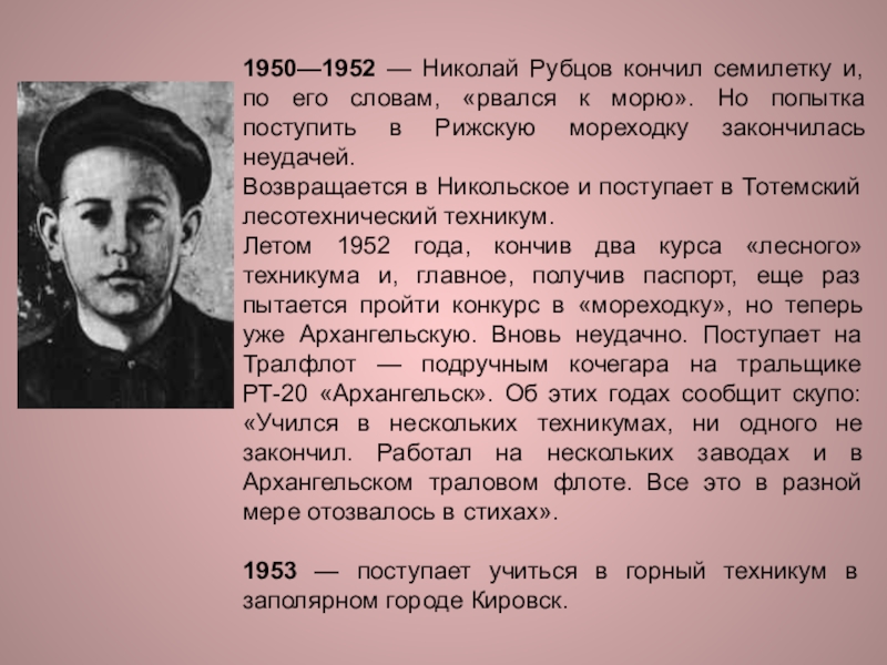 1950—1952 — Николай Рубцов кончил семилетку и, по его словам, «рвался к морю». Но попытка поступить в