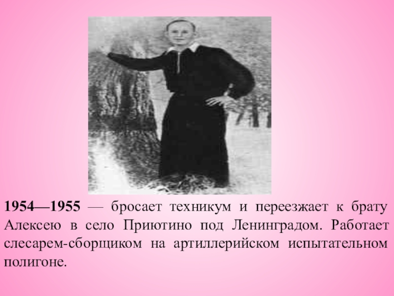 1954—1955 — бросает техникум и переезжает к брату Алексею в село Приютино под Ленинградом. Работает слесарем-сборщиком на