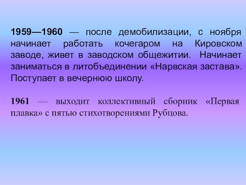 Слайд 101959—1960 — после демобилизации, с ноября начинает работать кочегаром на Кировском