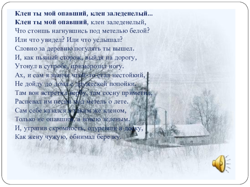 Слайд 11Клен ты мой опавший, клен заледенелый...