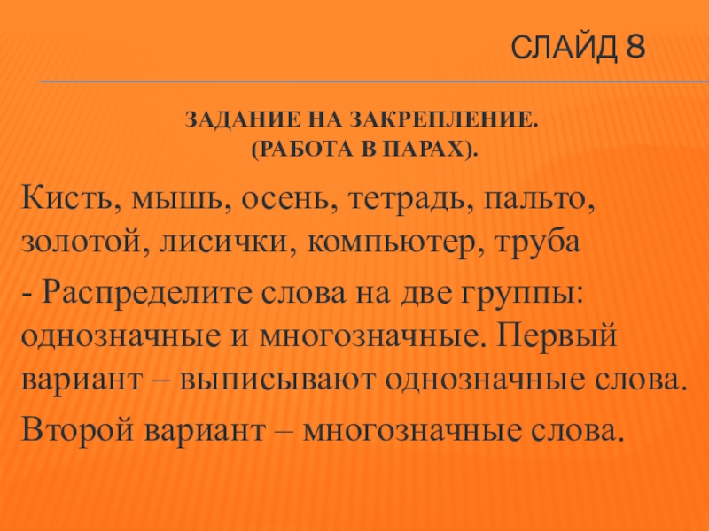 - Распределите слова на две группы: однозначные и многозначные. Первый вариант – выписывают однозначные слова.