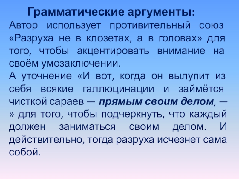 А метонимия «Баритоны кричат» делает акцент на том, как громко и открыто люди призывают: «Бей разруху»!. Автор использует противительный союз «Разруха не в клозетах, а в головах» для того, чтобы акцентировать внимание на своём умозаключении. А уточнение «И вот, когда он вылупит из себя всякие галлюцинации и займётся чисткой сараев — прямым своим делом, —» для того, чтобы подчеркнуть, что каждый должен заниматься своим делом. И действительно, тогда разруха исчезнет сама собой.