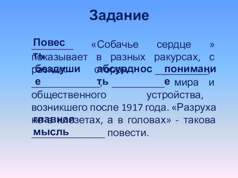 __________, _____________, __________ мира и общественного устройства, возникшего после 1917 года. «Разруха не в клозетах, а в головах» - такова ______________ повести.