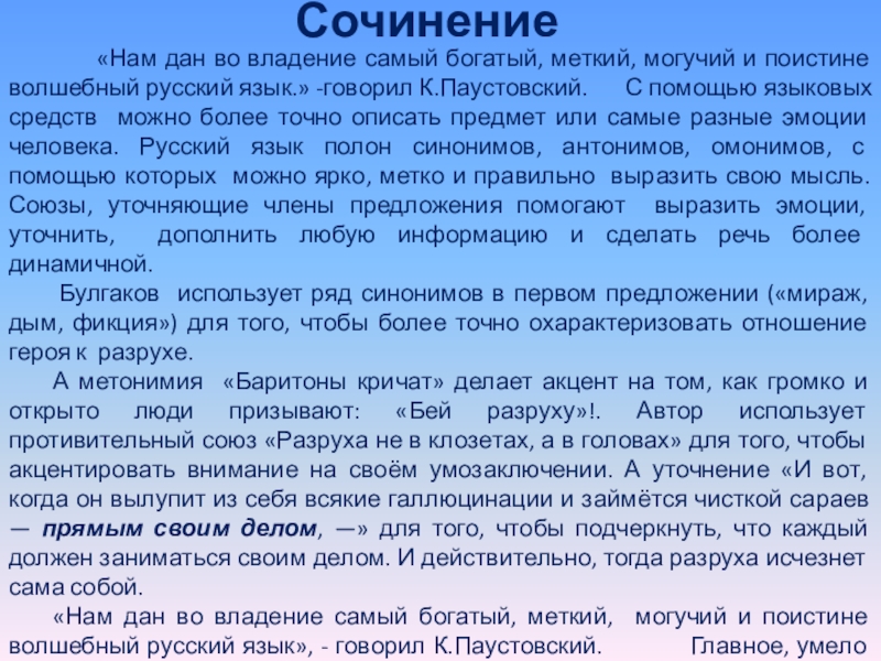 меткий, могучий и поистине волшебный русский язык», - говорил К.Паустовский. Главное, умело пользоваться его возможностями, а для этого нужно постоянно пополнять свои знания.