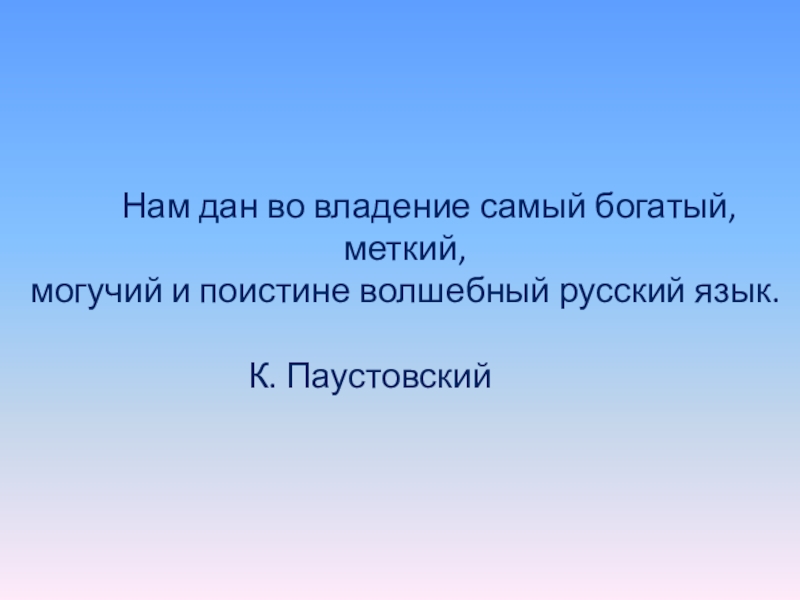 «Нам дан во владение самый богатый, меткий, могучий и поистине волшебный русский язык», - говорил К.Паустовский. Главное, умело пользоваться его возможностями, а для этого нужно постоянно пополнять свои знания.