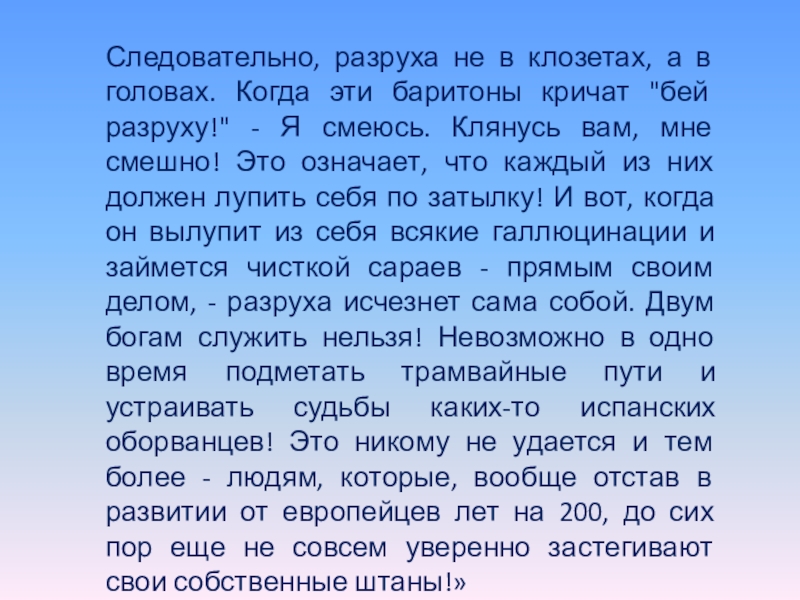 кричат "бей разруху!" - Я смеюсь. Клянусь вам, мне смешно! Это означает, что каждый из них должен лупить себя по затылку! И вот, когда он вылупит из себя всякие галлюцинации и займется чисткой сараев - прямым своим делом, - разруха исчезнет сама собой. Двум богам служить нельзя! Невозможно в одно время подметать трамвайные пути и устраивать судьбы каких-то испанских оборванцев! Это никому не удается и тем более - людям, которые, вообще отстав в развитии от европейцев лет на 200, до сих пор еще не совсем уверенно застегивают свои собственные штаны!»