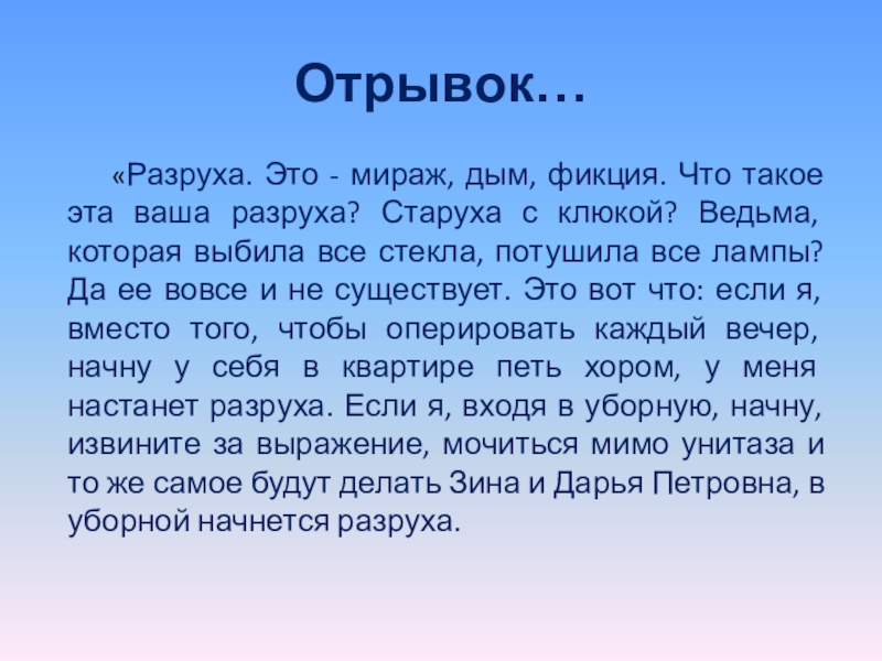 Старуха с клюкой? Ведьма, которая выбила все стекла, потушила все лампы? Да ее вовсе и не существует. Это вот что: если я, вместо того, чтобы оперировать каждый вечер, начну у себя в квартире петь хором, у меня настанет разруха. Если я, входя в уборную, начну, извините за выражение, мочиться мимо унитаза и то же самое будут делать Зина и Дарья Петровна, в уборной начнется разруха.