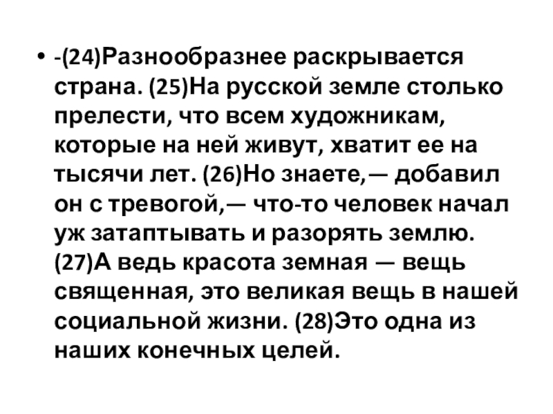 которые на ней живут, хватит ее на тысячи лет. (26)Но знаете,— добавил он с тревогой,— что-то человек начал уж затаптывать и разорять землю. (27)А ведь красота земная — вещь священная, это великая вещь в нашей социальной жизни. (28)Это одна из наших конечных целей.