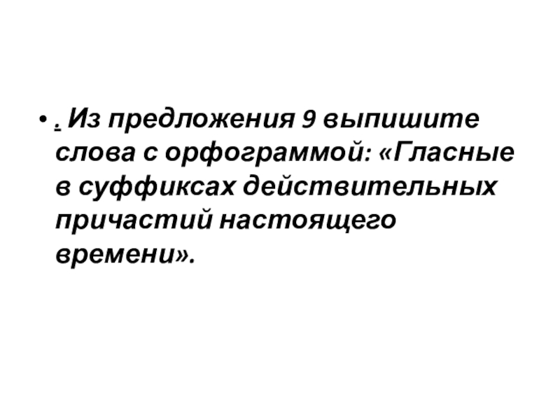 Слайд 5. Из предложения 9 выпишите слова с орфограммой: «Гласные в суффиксах действительных