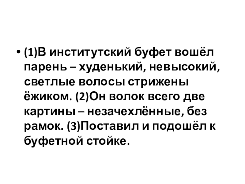 Слайд 8(1)В институтский буфет вошёл парень – худенький, невысокий, светлые волосы стрижены