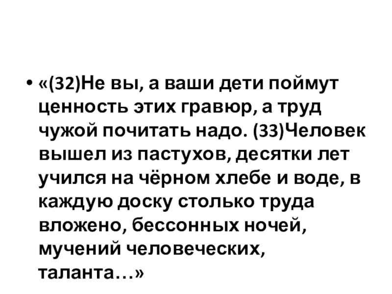 чужой почитать надо. (33)Человек вышел из пастухов, десятки лет учился на чёрном хлебе и воде, в каждую доску столько труда вложено, бессонных ночей, мучений человеческих, таланта…»