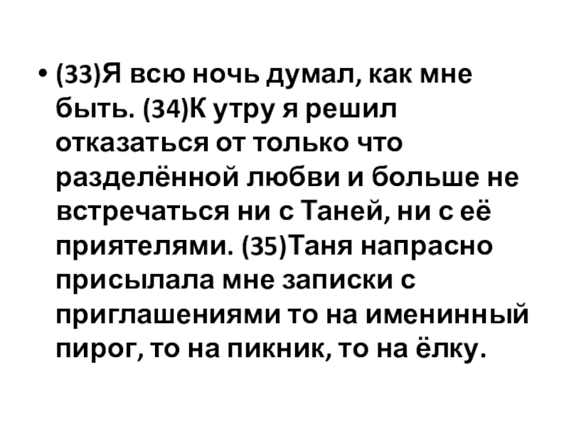 Слайд 14(33)Я всю ночь думал, как мне быть. (34)К утру я решил