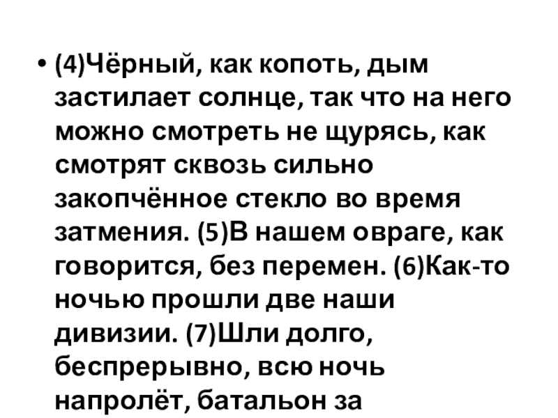 смотреть не щурясь, как смотрят сквозь сильно закопчённое стекло во время затмения. (5)В нашем овраге, как говорится, без перемен. (6)Как-то ночью прошли две наши дивизии. (7)Шли долго, беспрерывно, всю ночь напролёт, батальон за батальоном