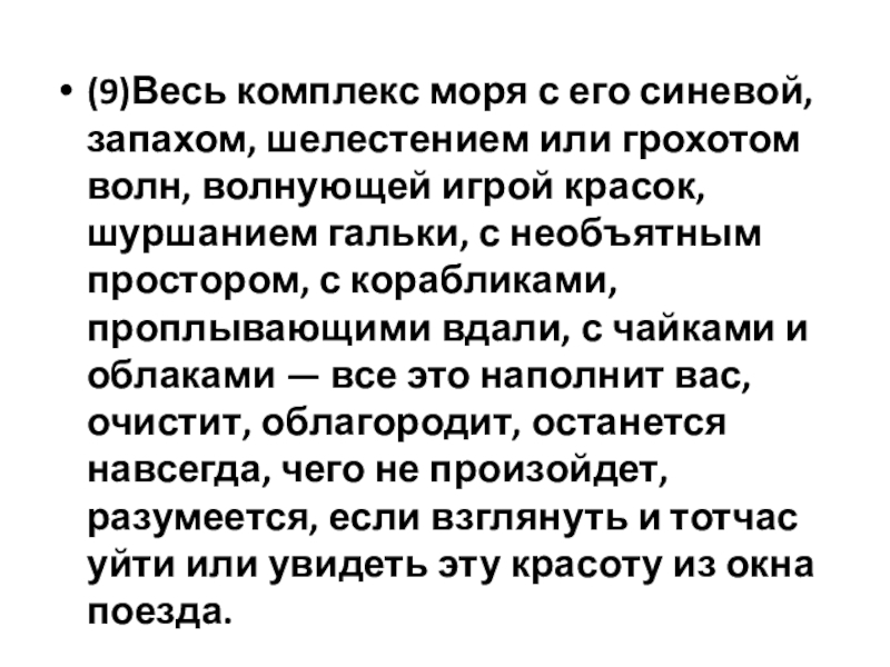 Слайд 6(9)Весь комплекс моря с его синевой, запахом, шелестением или грохотом волн,